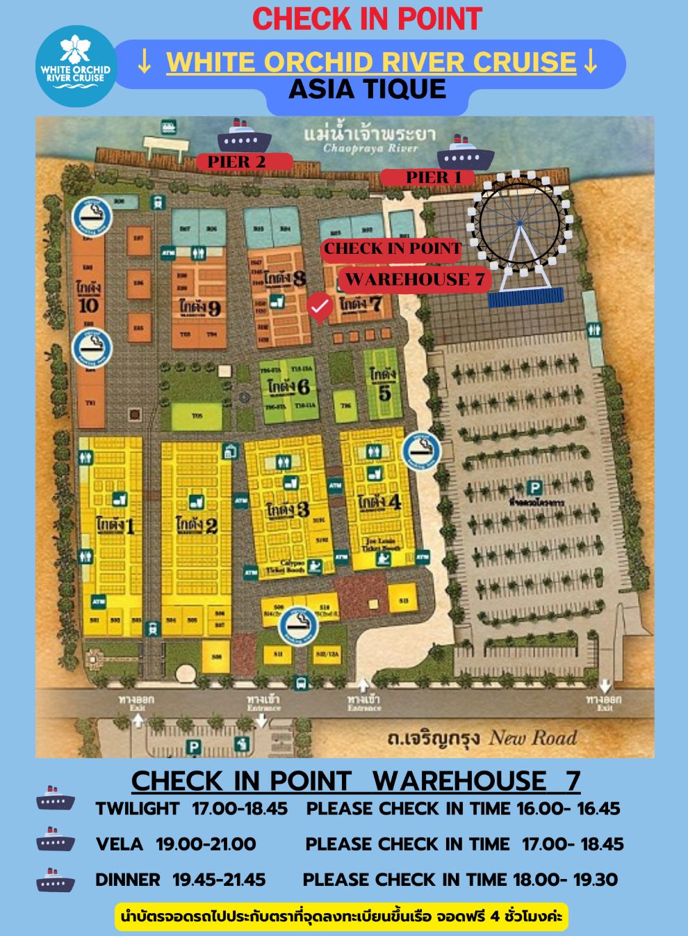 - ทางบริษัทจะจัดส่งรายละเอียดการเช็คอิน เวลา และสถานที่ขึ้นเรือ ให้กับลูกค้า