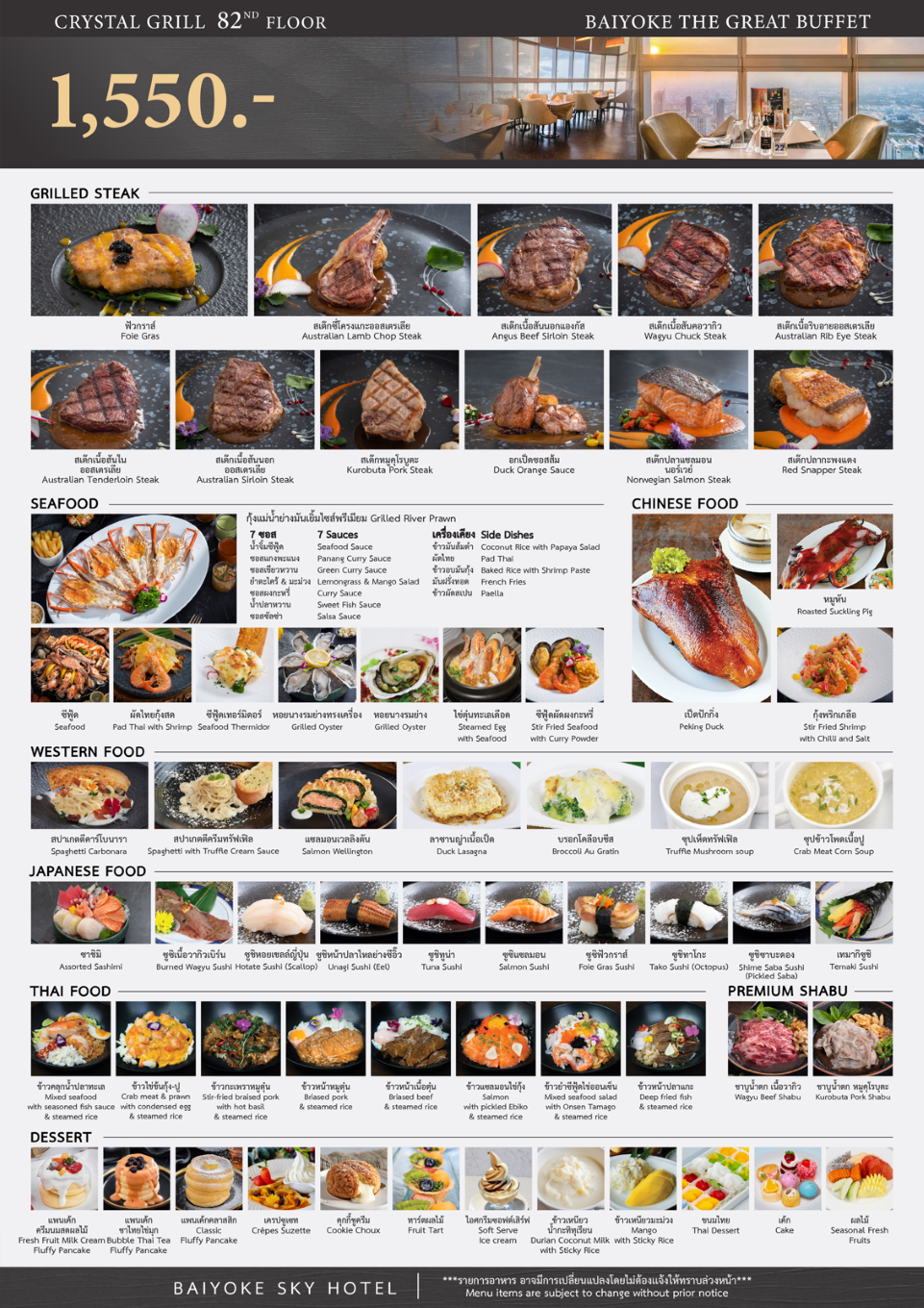 Dinner: ตึกใบหยกสกาย Crystal Grill Restaurant ชั้น 82 – International Specialized Premium Seafood & Steak Buffet บุฟเฟ่ต์ 2 ชม.