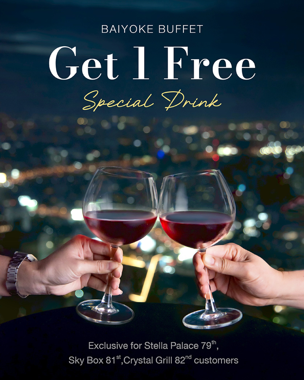 ดินเนอร์ชมวิวบนตึกใบหยกสกาย!! ณ ห้องอาหาร Crystal Grill Restaurant ชั้น 82 เป็น International Specialized Premium Seafood & Steak Buffet เต็มอิ่มจำกัดเวลา 2 ชั่วโมง เสิร์ฟอาหารไม่อั้นกับบุฟเฟ่ต์นานาชาติ+ซีฟู้ด กุ้งเผา หอยเผา แซลมอนซาชิมิ ซูชิ อาหารจีน ญี่ปุ่น สเต๊กและอื่นๆอีกมากมาย ฟรี! เครื่องดื่ม Soft drink, น้ำดื่ม, น้ำผลไม้สดปั่น พิเศษสุดรับฟรี! ชมวิว บนชั้น 77 และดาดฟ้าพื้นหมุน ชั้น 84 อีกทั้งได้เพลิดเพลินกับความพิเศษสุดรับเพิ่มฟรีอีก 1 Drink at Roof Top Bar on 83rd floor